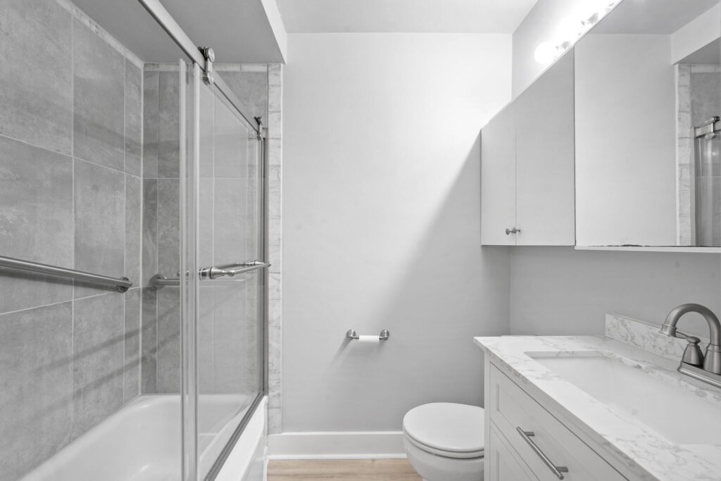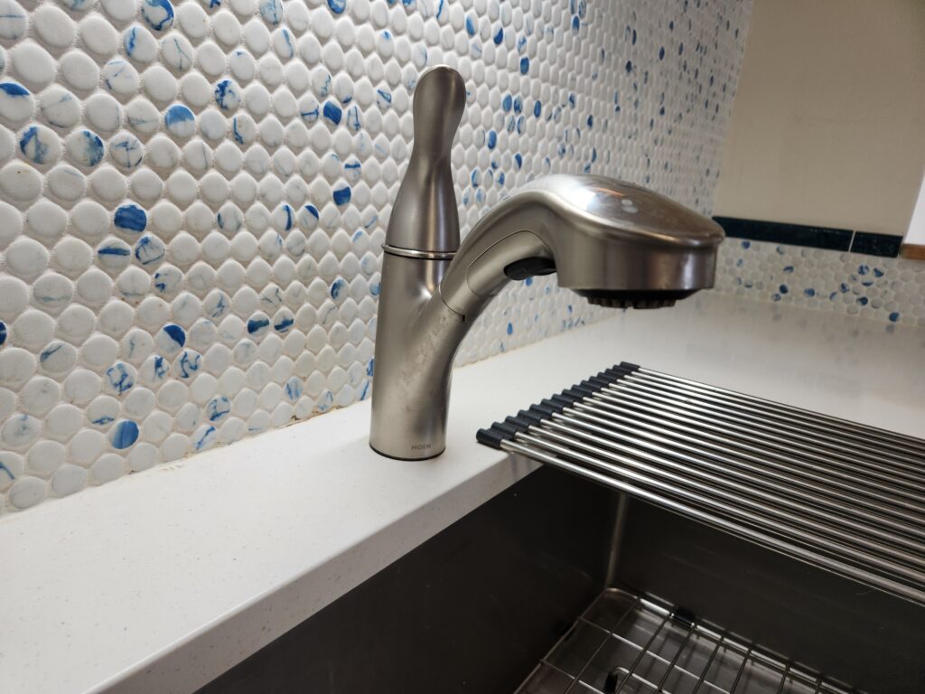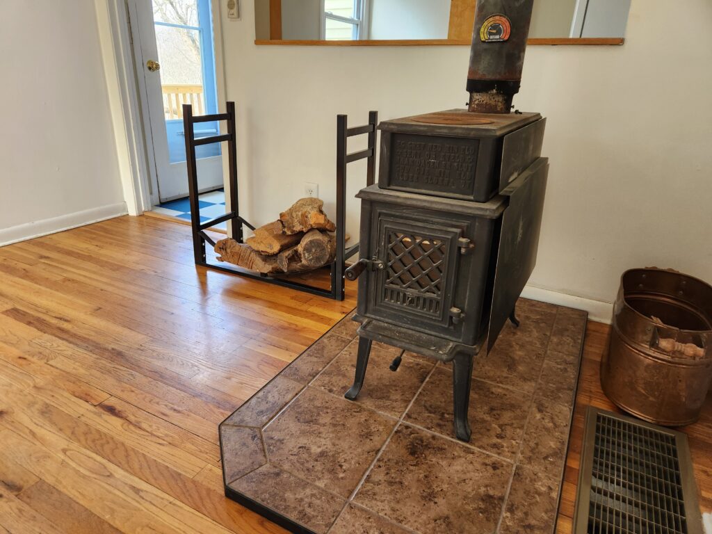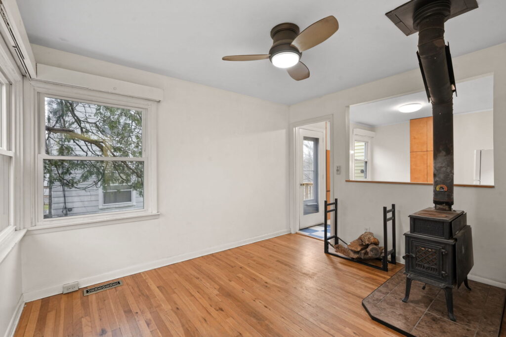 A cozy dining area with a woodstove flows nicely into the updated kitchen, complete with newer commercial-grade vinyl flooring, quartz countertops, mosaic tile backsplash, gas range and refrigerator.
