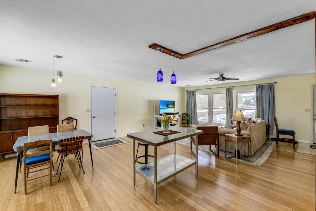The open floor plan and warm bamboo flooring create a bright, welcoming space where the living room flows naturally into the dining area and kitchen, filled with sunlight throughout the day!